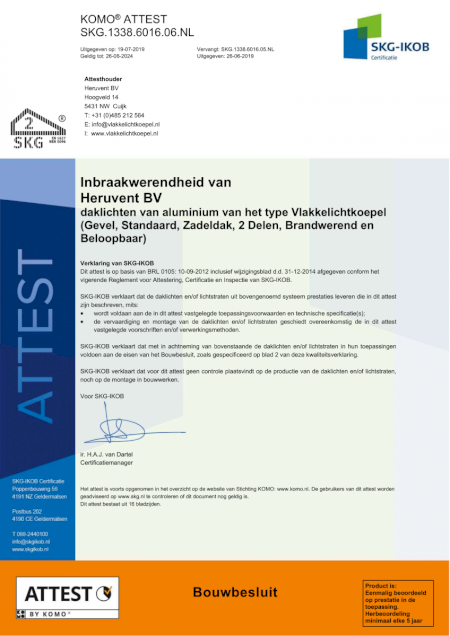 De vlakkelichtkoepel is getest door SKG op inbraakwerendheid. Hierbij is getest volgens Nederlandse en Europese norming: NEN 5096:2011 en EN1627:2011. De vlakkelichtkoepel kwam glansrijk door de beproeving en heeft inbraakwerendheidsklasse 2 behaald wat vereist is voor het Politiekeurmerk Veilig Wonen.